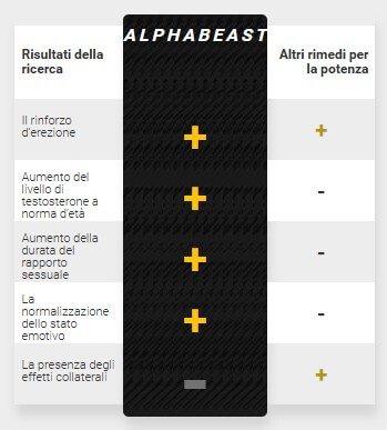 AlphaBeast e’ un rimedio innovativo per рrisolvere tutti i problemi con la potenza maschile. Abbiamo tanti anni condotto le ricerche dei vari estratti vegetali e componenti naturali, abbiamo collegatole e abbiamo controllato il loro funzionamento. Alla fine siamo riusciti a trovare una combinazione dei componentiche libera l’uomo dai problemi fisiologici con la potenza.