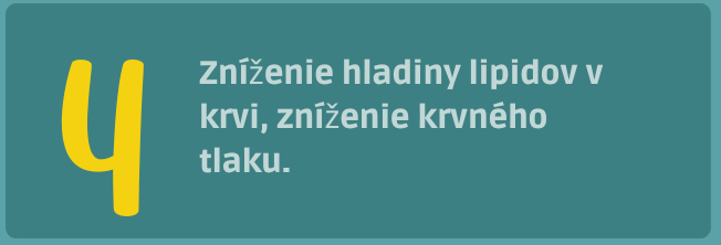 - Zníženie hladiny tukov v krvi, zmiernenie vysokého krvného tlaku.